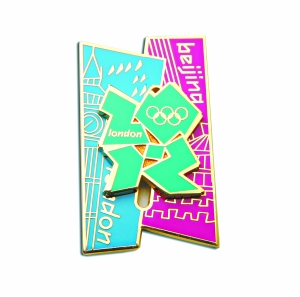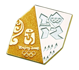 这两款徽章是为纪念2008年北京奥运会与2012年伦敦奥运会交旗仪式而设计的。一款没有采用任何着色,完全靠金属本身不同电镀方式产生的金银两色;另一款徽章中的“2012”金属块可以滑动,仿佛旗子在旗杆上升降。
